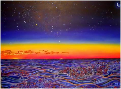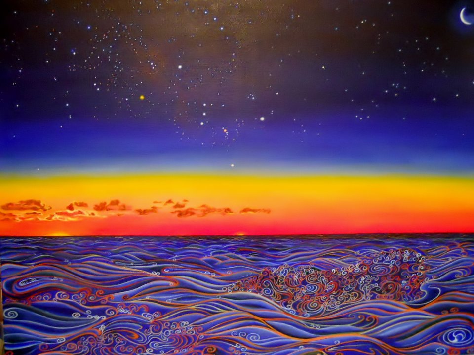 この絵は、マグロ釣りの際に見た外洋の明け方の光景をもとに描きました。世界は神秘に満ちています。
