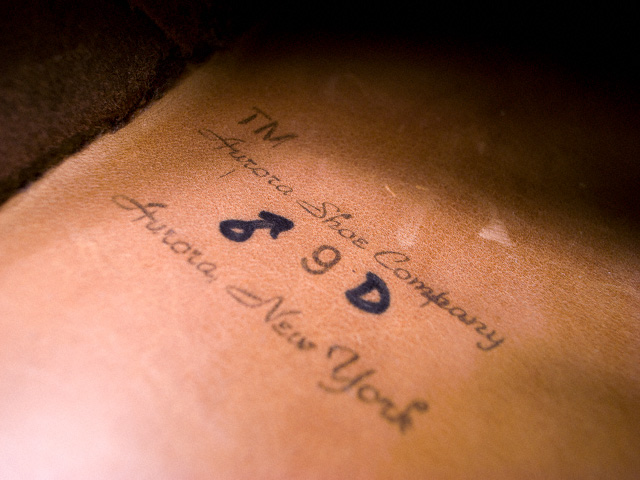 数ヶ月前にバックオーダーしたAurora Shoesが New York Auroraから来日。 Middle English サイズ表示がなんとも手作り手書き ♂オス用:米国サイズ表示で9:幅がD Aur …